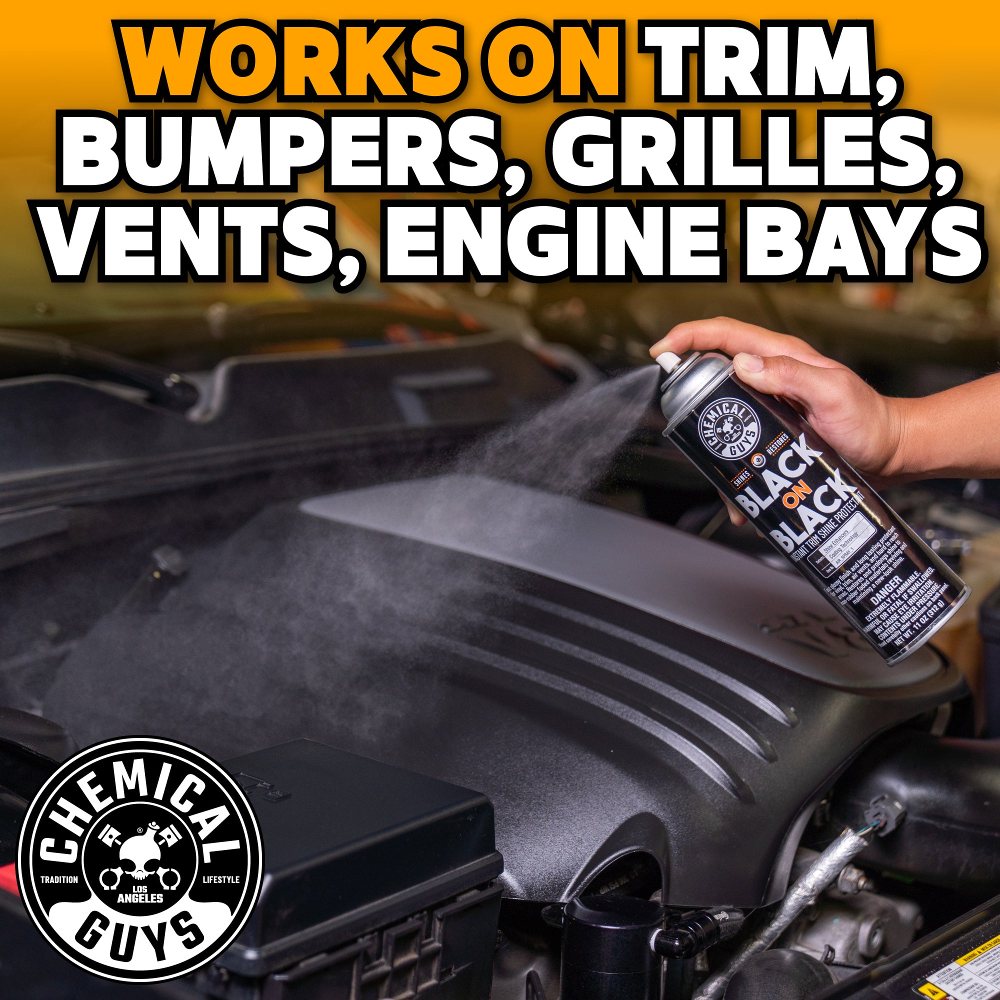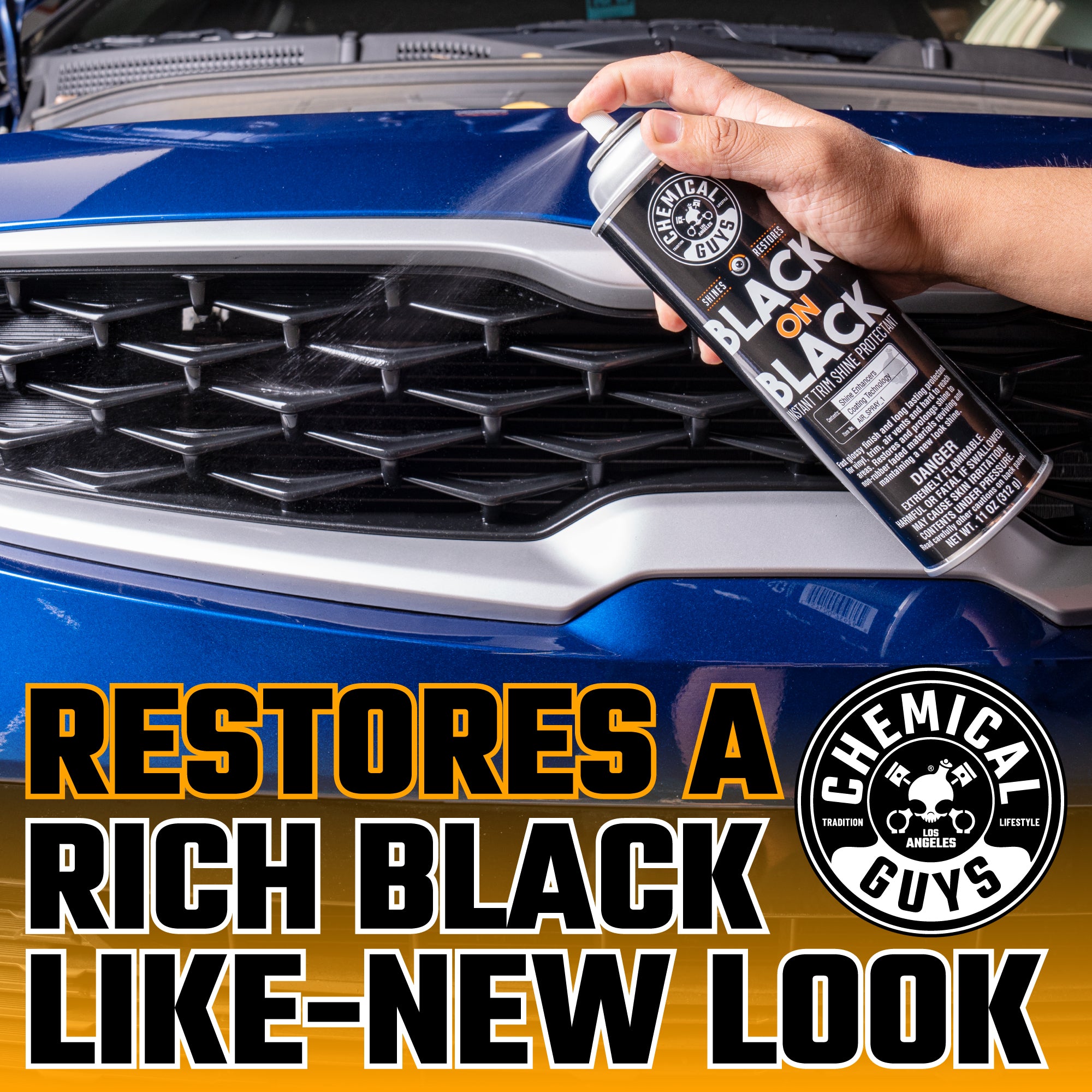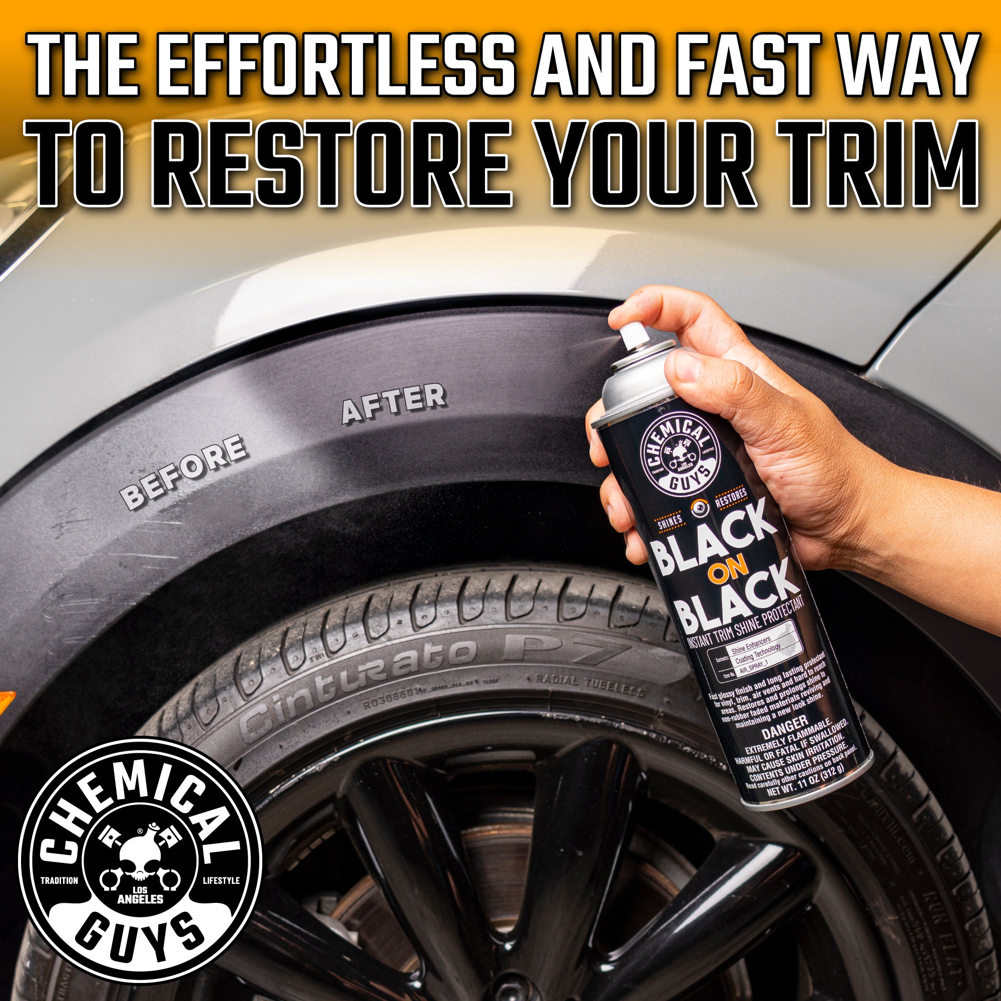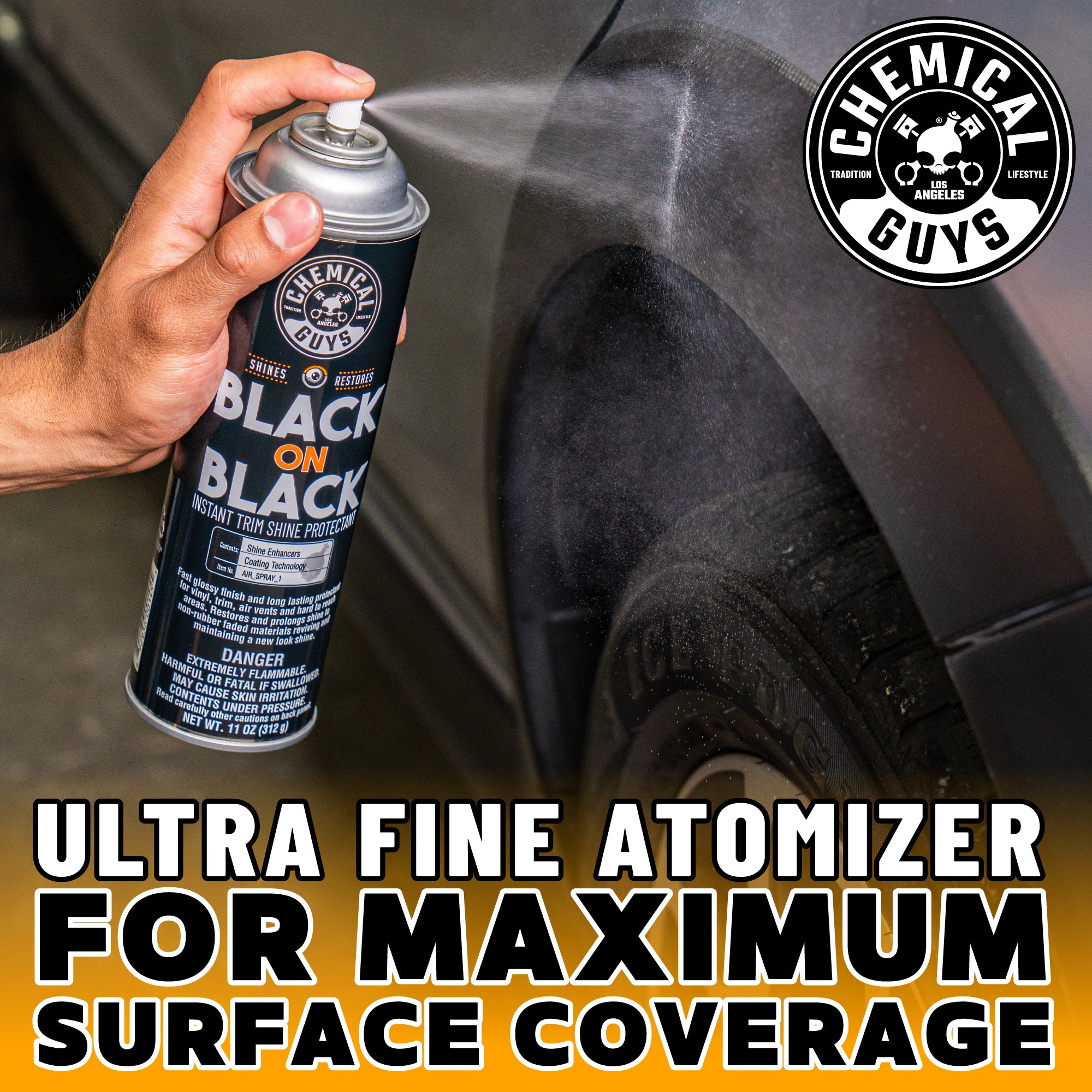 Black on Black is an instant dressing that uses an ultra-fine atomizer to spray thin coats into hard-to-reach trim parts. It easily restores a rich. black. like-new look to your trim.