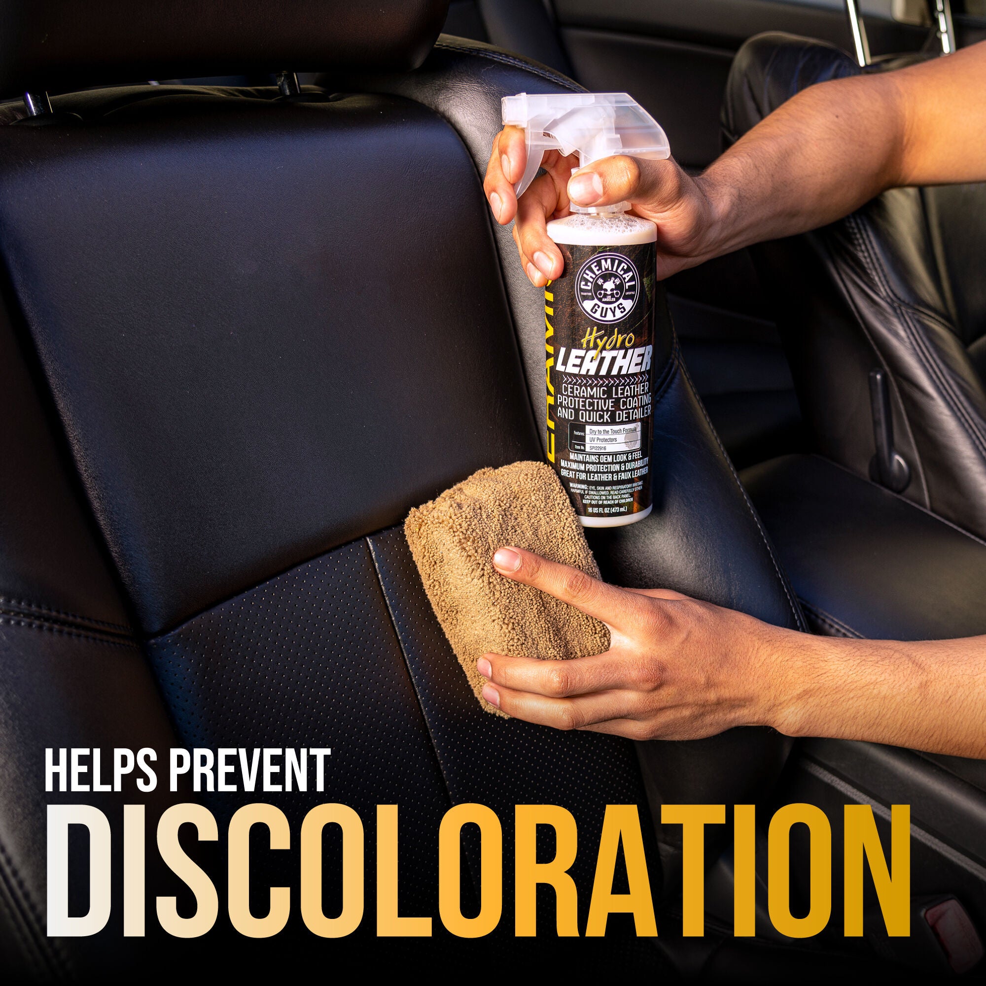 HydroLeather puts a durable. protective ceramic barrier on leather surfaces. which helps resist dirt. UV rays. and discoloration. Keep your leather looking and feeling brand new for longer without leaving behind any residue.